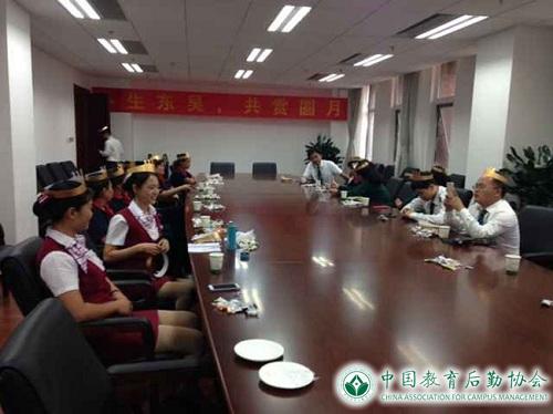 27日下午3点,在南开大学综合业务楼西楼,寿星员工们围坐一堂,由分部办公室布置的各类水果、月饼、蛋糕及各类小吃点心铺满一桌,寿星们头戴生日皇冠,满脸喜气洋洋。