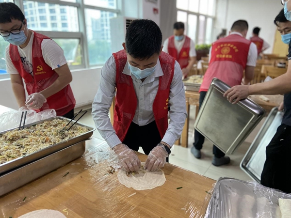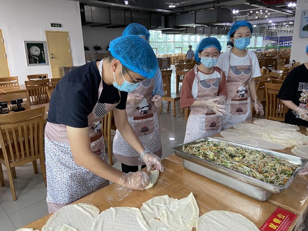 上午,后勤处处长单显勇带领部门人员与学生代表在一号食堂三楼教工餐厅共包薄饼、话家常。为增强学生端午民俗体验感,后勤处邀请省外学生共同体验包薄饼这项温州端午传统风俗。师生联谊送关爱的活动环节,让后勤老师们对同学们的在校学生生活情况有了更进一步的了解,同学们对后勤服务工作也提出了自己的建议。活动现场,老师们还为同学们送上端午礼品和节日祝福。