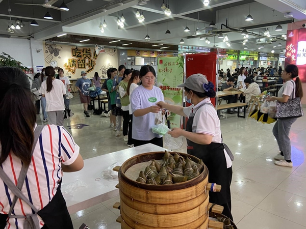 中午,各餐厅共准备了3000余枚粽子、1000余份薄饼、上百份咸鸭蛋与水果等免费发放给前往就餐的师生,让师生在美食中感受中国传统文化。并且,在餐盘回收处旁开展“光盘有礼”活动,培养师生勤俭节约习惯。