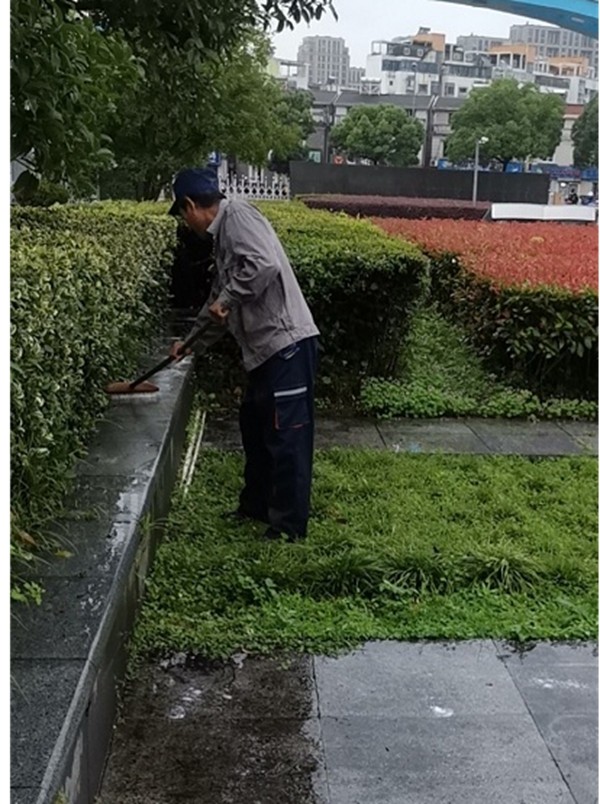 6月20日,恰逢雨天,师傅们趁着雨势,冒雨赶往广场对花坛及周边的地面进行清洗。雨势渐大,师傅们拿起清洗工作顺势利用雨水冲刷地面,现场师傅们热火朝天的劳动场面与雨势交相呼应。