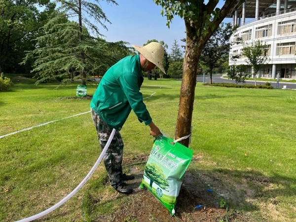 后勤服务中心多措并举,在已安装喷灌系统的区域,选择在早晨低温时段开启喷灌设备,给植物降温增湿,改善小气候,缓解高温和太阳直射造成的伤害;对人行道树木、灌木、花箱等,就近利用消火栓水、东湖水等多处水源同时灌溉,想方设法扩大浇灌面积,保障抗旱用水需要;为珍贵树木安装滴灌袋,以少量多次的灌溉方式,提高水资源利用效率;对易旱和缺少水源的区域,出动洒水车浇灌,每日洒水超过30t。所有绿化养护员工尽己所能,努力为植物浇上“救命水”,高温干旱对校园绿植的影响被降到最低。