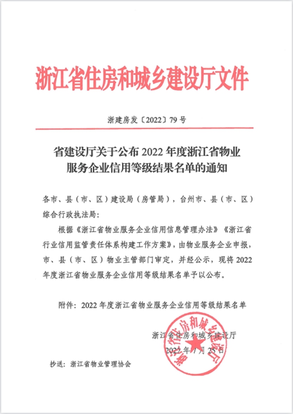 据悉,浙江省住房和城乡建设厅为建立健全物业服务企业信用体系,促进物业服务企业诚信自律,按照“公平、公正、公开”的原则每年开展一次信用评定。物业服务企业信用等级按照企业信用综合得分由高到低,分为AAA、AA、A、B和C五个等级;评定内容由企业经营信息、物业服务项目创优等核心要素构成。浙大新宇经过前期公开信息采集、线上资料申报、专业资质体系认证,县、市、省三级物业主管部门审查,被认定为2022年度浙江省物业服务企业信用等级AAA级。