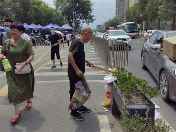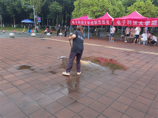 在校门口,新栽的鲜花,向新生发出UESTC的第一声问候。在迎新现场,保洁人员组成流动工作组,加大保洁频率和力度,及时清除垃圾、开展消毒,用干净整洁的面貌迎接新生。