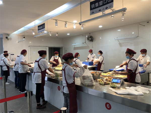我校学生公寓楼分布较广,为了提高工作效率,确保在最短时间内将爱心餐食送到各寝室,饮食服务部在餐厅一楼设立了“餐品打包分拣档口”,餐厅工作人员兵分五路,专人专职,准时准点将餐食送至各公寓楼。公寓服务部指定各公寓楼长对接每个楼层,各楼宇值班阿姨通力合作、抢抓效率,确保将热乎乎的饭菜及时送至同学们手中。订餐、核餐、打包、装袋、送餐……每一个环节都有条不紊,每一个步骤都严谨细致,充分彰显了后勤人的速度与温度。