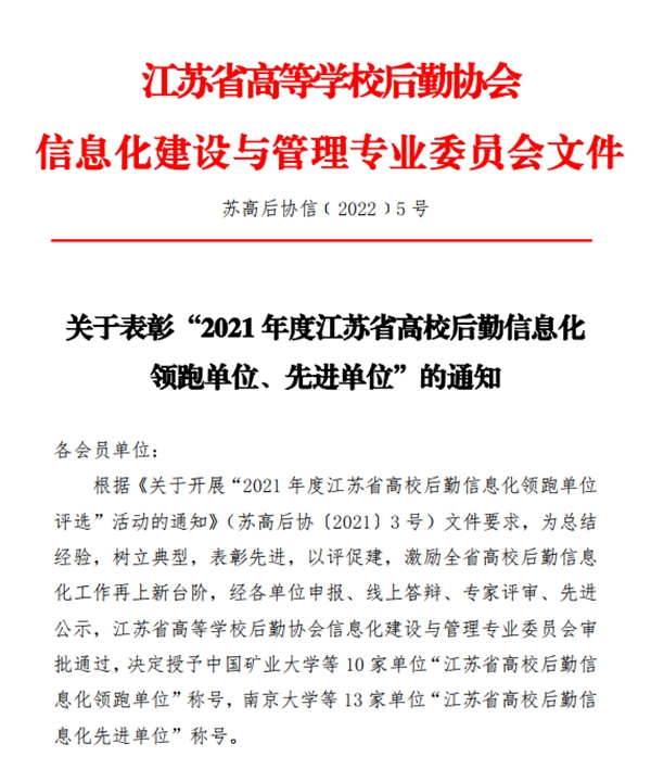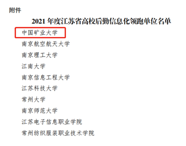 10月12日,江苏省高等学校后勤协会信息化建设与管理专业委员发布关于表彰“2021年度江苏省高校后勤信息化领跑单位、先进单位”的通知,中国矿业大学荣获“2021年度江苏省高校后勤信息化领跑单位”称号。