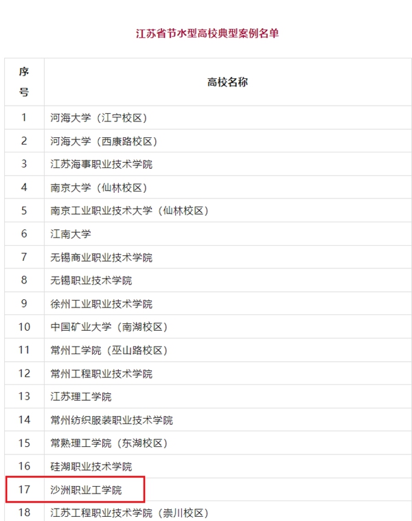近日,江苏省水利厅、教育厅、机关事务管理局联合公布了江苏省首批节水型高校省级典型案例名单,共有26个高校案例入选,沙洲职业工学院申报的《践行新发展理念 助力建设美丽中国》案例成功入选。