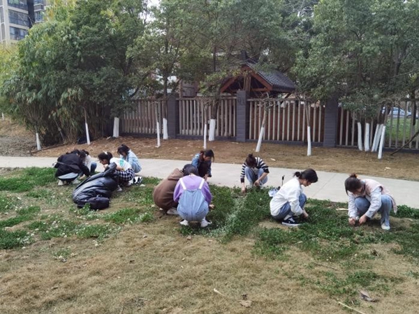 另一边处理杂草和落叶的同学们也不甘落后,拿着工具干得热火朝天。