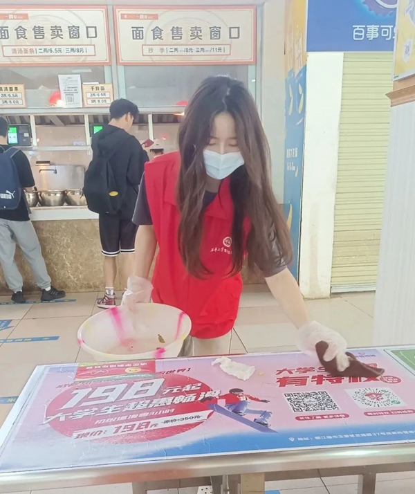 食堂组志愿者们来到食堂后厨、库房等区域,参观了菜品烹饪备餐、米饭生产线、农残检测、原材料采购、食品安全留样、卫生管理等流程,系统了解到食堂食品安全等情况。在中午和下午师生用餐时间,志愿者们来到了各食堂,协助食堂叔叔阿姨们进行收倒饭菜、收拾餐具、清洁饭桌、清扫地面,维持就餐秩序等工作。一次又一次重复收餐擦桌,让大家体会到了食堂工作的辛苦与不易。志愿者们表示:“这次活动让我对学校食堂有了全新的认识,未来,我会更加珍惜粮食、爱护食堂的整洁有序。”