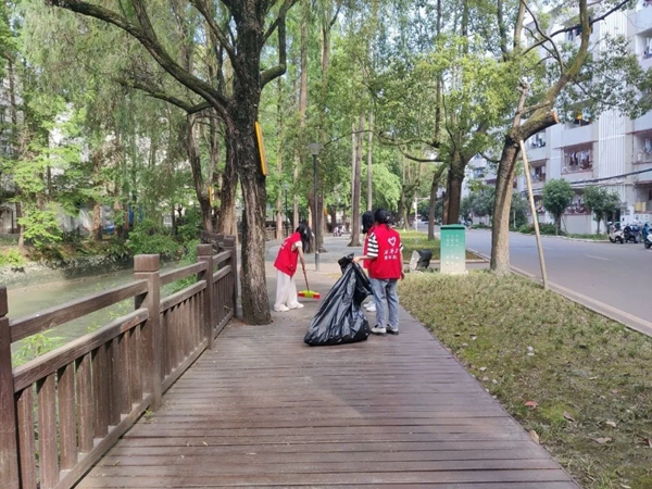 环卫组的志愿者们在校园主干道、各公共区域开展环卫清洁工作,他们手持扫帚、垃圾铲等工具清洁地面,打扫校园卫生死角。通过劳动,同学们亲身体验了建设美丽西华校园的全过程,认识到每个人都是校园文明的参与者和建设者。身着红马甲、挥洒汗水劳作的志愿者们,成为了校园艳阳下一道靓丽的风景线。