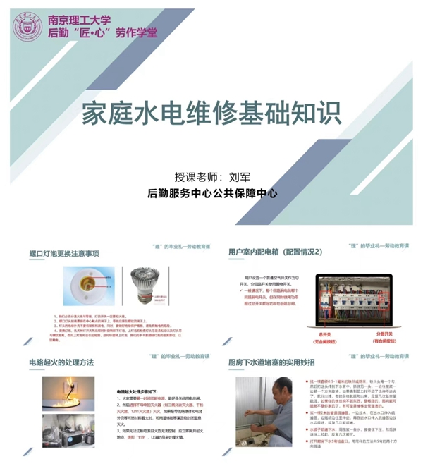 “授人以鱼不如授人以渔”。本次课程是毕业生在校的最后一节劳动教育课,也是他们踏入社会前的第一节“必修课”。为了提升毕业生们的生活技能,后勤公共保障中心特地安排了从业三十年,维修经验丰富的师傅进行授课和现场实操,课程从生活中常见的水电问题出发,让同学们熟悉家庭水电设施设备及故障应急处置方法,指导同学们在保障安全的前提下能动手解决生活中出现的简单维修问题。如更换电灯泡、跳闸恢复、疏通下水道堵塞等实用技巧。并且,老师还细心的讲解了需要注意的安全知识:禁止用湿手接触带电的开关,也不能用湿手更换电气元件或灯泡;漏电开关跳闸后,必须查明原因才能再合上开关电源,任何情况下不得压住漏电开关跳闸机构强行送电;家用电器通电后发现冒火花、冒烟或有烧焦味等异常情况时,应立即停机并切断电源,再进行检查……
