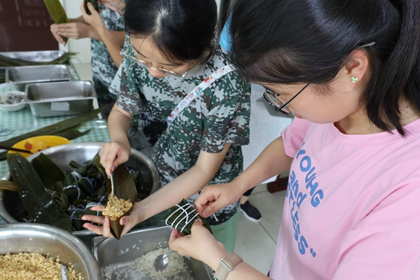 米香怡人,粽叶飘香,和园餐厅二楼,桌子上摆满了粽叶、糯米、肉馅、豆沙等食材。活动开始,和园餐厅主管现场解说了端午节包粽子的习俗由来及粽子的结构、花色等内容,同学们听了讲解,跃跃欲试。两位面点师现场演示教学,手把手向教官和同学们传授裹粽子技艺,从卷粽叶、添糯米到绑细线,开始时很多同学没有经验,会出现漏米,捆绑松散等情况,但通过反复的尝试,推倒重来,同学们虚心请教、相互学习、相互协作,一个个形态各异,大小不一的粽子很快装满了盆。