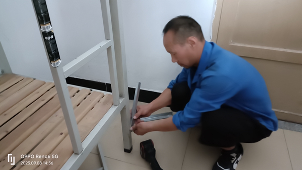 以“心”迎“新”,暖心贴心。夏荷楼、春雪楼、时雨楼迎新点位,橙蓝相间、白色底板的新生住宿登记点提示牌格外引人注目,不时有新生及家长驻足查看宿舍分布情况。在新生正式入校报到前中心办公室联系广告公司制作了简洁、实用的住宿提示牌,提前悬挂在相应的迎新点位,便于新生能快速识别所住楼栋、宿舍。夏荷楼学生公寓的电梯在今秋开学季正式投入使用,学生公寓小型维修师傅罗全勇化身电梯安全引导员,正在安全、有序引导新生及家长乘坐电梯,一句句温馨提示、一次次用手遮挡电梯门,避免电梯门夹人。从早7点到晚8点,虽然很疲劳,但看到孩子们及家长有序乘梯、安全离梯,罗师傅的脸上露出了欣慰的笑容。“老师,您好。春雪楼5-62宿舍即将入住一名身高一米九六的学生,能否给他的床进行加长改造?”9月6日下午,外国语学院的一名男生来到中心办公室提出诉求。“好的,没问题,我先记在本子上。待学生来校报到入住宿舍并确定所住床位后,我立即联系师傅为他进行床铺改造加长。”中心管理人员陈超热情回应了学生。8日下午,分管学生公寓管理与服务中心工作的后勤管理处(后勤服务中心)副处长张邦利在得知这一情况后来到春雪楼5-62宿舍,和宿管老师胡云波一起见到了身高一米九六的阮同学,并和他亲切交流。随后维修师傅带着专业工具如约来到该宿舍,做好防护措施后,切割、拆卸、打磨、喷漆、安装,在维修师傅的一番“折腾”下,床铺加长改造完成。阮同学现场体验了加长20公分的床铺后表示很满意,消除了他的入睡后顾之忧。阮同学笑着说道:“真心感谢学生公寓管理与服务中心的暖心贴心服务和学校的悉心关怀。”当天,春雪楼4-45宿舍也迎来2位身高1.9米+的新生入住,维修师傅对他们的钢架床也分别进行改造,加长20公分,以便高个子同学能舒舒服服地躺下。