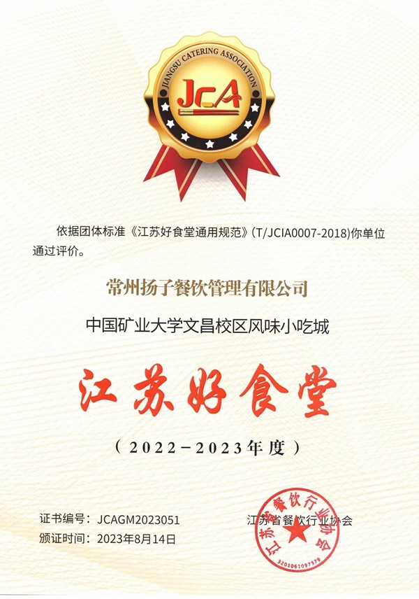 近日,由江苏省餐饮行业协会主办的第八届中国·江苏团膳产业发展大会在江苏无锡举行,中国矿业大学文昌风味小吃城餐厅被授予2022-2023年度“江苏好食堂”荣誉称号。