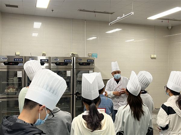 此次体验活动主要包括参观食堂后厨、了解食堂日常工作和实际操作等项目。在参观食堂前,同学们根据食堂工作要求穿戴好口罩、围裙、帽子等工作服,随后在桂园餐厅经理的带领下,走进后厨进行参观。餐厅经理向同学们介绍了餐厅的基本情况,详细讲解了食品原材料采购、储存、生产和加工等方面的安全管理和监控措施。同学们先后参观了餐厅米饭蒸煮流水线、切配间、洗碗消毒间、食品留样处、销售间、冷库、原材料仓库等场所,观摩了餐厅后厨工作人员切配、烹饪、食品加工等工作环节,整个参观过程是餐厅食品加工一系列工作流程的真实展现。同学们还就餐厅米饭蒸煮流水线、餐具清洗消毒程序、食品加工操作流程等方面的安全管理和监控措施进行了提问,饮食服务部相关负责人、餐厅经理对问题进行了逐个答疑。