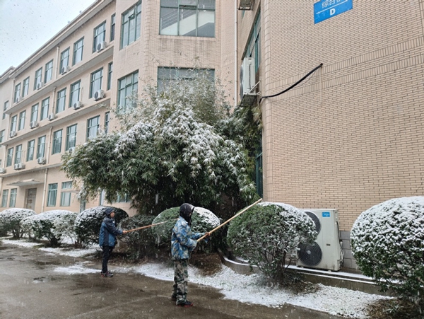 为防止行道树积雪断枝,保护绿化树木完好,保障师生安全出行,江苏科技大学物业中心绿化项目部启动应急预案,组织应急抢险队伍,清理树木上的积雪,持续奋战在除雪护绿第一线。清理断枝10余处,分段包干,对校园绿地的绿化树木及时进行抢救和保护,采取竹竿打雪和人工摇落等措施,清除树木上的积雪,减轻苗木的负重,避免苗木倒伏或枝条折断,力争将大雪对绿化造成的损失减少到最低限度,并及时锯掉、清理被积雪压断的树枝,避免给行人和交通造成危害。