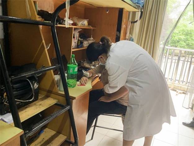 学生突发不适的应急演练设置在勤学苑5-7号楼学生公寓。“阿姨阿姨,我们寝室有同学身体不舒服……”在勤学苑5-7号值班室,一名学生急匆匆地从寝室跑来向值班阿姨求助。值班员一边跟随学生赶往寝室,一边了解学生的所在学院、姓名、寝室号等相关信息,并第一时间向楼长、保卫处、校医院进行汇报。待楼长赶到寝室后,及时询问学生感受并对其进行安抚,同时联系学生所在的二级学院辅导员说明情况。5分钟后,相关人员陆续抵达现场,在校医院医生的诊断后,由保卫处工作人员和二级学院辅导员共同将学生送往医院进行医治。