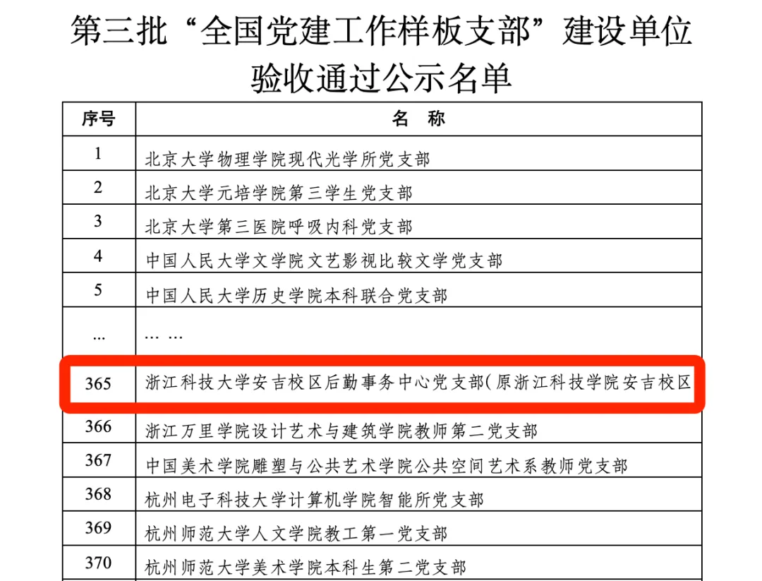 2024年8月27日,教育部思想政治工作司公布了第三批新时代高校党建示范创建和质量创优工作建设单位验收结果,浙江科技大学安吉校区后勤事务中心党支部顺利通过“全国党建工作样板党支部”验收。