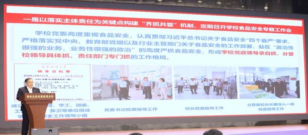 学校党委认真贯彻落实习总书记关于食品安全“四个最严”要求,站在“政治性很强的业务,业务性很强的政治”的高度严抓食品安全。形成了体制机制完善的食品安全共治共管体系;建立了“一体四维”的专业技术检测、网格管理巡查、专项小组督查和日常精细管理手段;以智慧食堂建设为抓手,实现食品安全管理现代化标准化;坚持“接诉即办“排忧解难,有力维护校园和谐稳定大局。