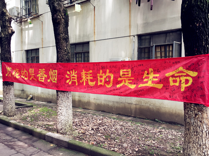 近几年,高校大学生中吸烟人群不断扩大,大学生由于缺乏对烟草危害性的认识,常常因为好奇或逞强而染上烟瘾,给健康带来很大危害。因此,在2016年5月31日——世界第29个无烟日到来之际,东吴物业宿管(东区)中心在苏州大学老校区展开了一场大规模的戒烟宣传活动。通过张贴宣传海报、发放宣传彩页、邀请学生在横幅上联名签字等一系列活动,让学生们自觉抵制烟草,珍爱生命。