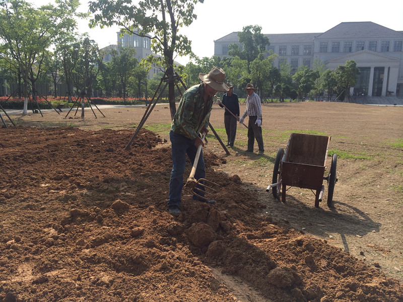 接着,将用翻土机翻土,预计于7月中旬播撒高羊茅草草籽,8月初将长出新草,8月20日左右中央草坪将恢复生机,还一片绿色。