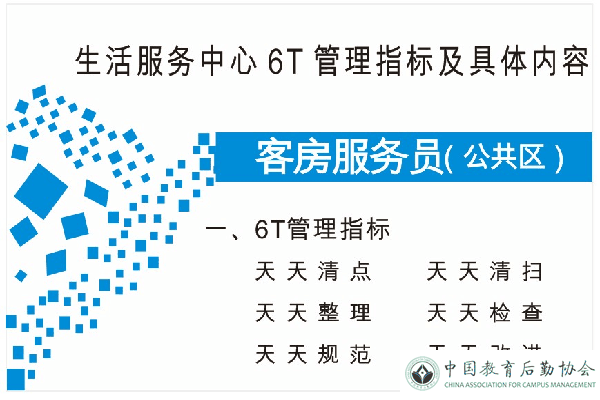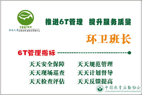 检查中,各中心的特色亮点得到检查人员的一致好评。其中,饮食服务中心将创建6T食堂与创省优样板食堂工程相结合,统一制作标识牌在食堂张贴,实施食堂标准化管理。能源管理中心将“两学一做”与6T管理相结合,把天天清扫与暑假期间设备检修相结合,组织党员同志到窗口学习,全面清扫配电间卫生。物业管理中心将劳动竞赛和高标准物业管理楼栋相结合,组织员工培训。校园管理中心和生活服务中心制作发放了每个岗位的6T管理小卡片,修建服务中心给每位员工发放了6T相关资料,使6T实务要点清晰明了、深入基层。