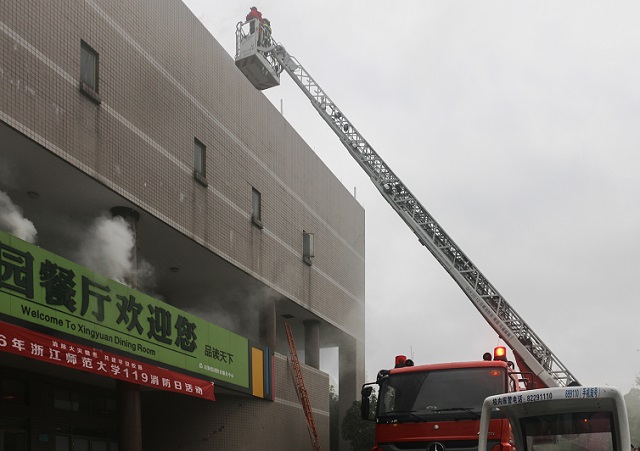 为增强师生员工的消防安全意识,提高灭火和疏散逃生能力,11月8日,后勤集团、保卫处、金华消防支队特勤大队联合举办了以“消除火灾隐患,共建平安校园”为主题的消防疏散演练及高层云梯救援、救生气垫逃生演示活动。校保卫处处长傅志刚、后勤集团总经理丁敢真任总指挥;校学生处副处长尹浩冰、校保卫处副处长陈仁伟、后勤集团副总经理严建春、金华公安消防支队特勤大队相关负责人任现场指挥。后勤集团各中心(公司)消防员、安全员、学生代表等490余人参加了此次演练。