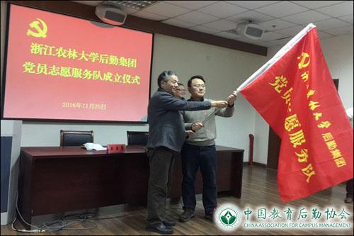 成立仪式上,王自勇同志为“后勤集团党员志愿服务队”、“第二党支部党员志愿服务小分队”、“第六党支部党员志愿服务小分队”授旗。集团党总支书记钱杭园同志宣读了《关于组建浙江农林大学后勤集团党员志愿服务队的通知》。