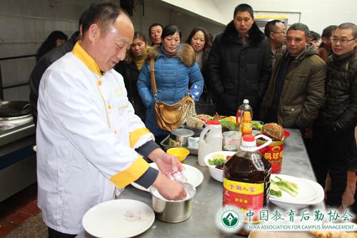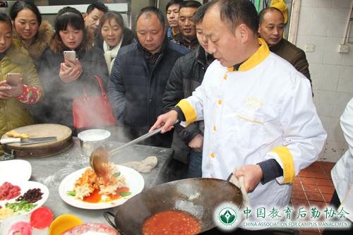 会后,大家来到长江路校区教工餐厅进行现场培训。现场,卞志敏、罗来庆两位老师向大家展示了“荷塘月色”、“麻婆豆腐”、“菊花鱼”三道精致菜肴,边讲解边演示制作要领,全程与学员们进行亲切的互动。参加培训的学员热情高涨,被两位老师精湛的厨艺深深地震撼,在认真观摩的同时情不自禁纷纷拿出手机拍照,学习氛围浓厚。