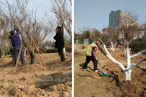 早春二月,苏北大地气温开始回升,各种苗木也处于萌动前的休眠状态,这正是绿化造林的大好季节,此时移植苗木也可减少对树木的损伤,是苗木移栽的最佳时期。后勤管理处配合校区调整工作也对部分树木进行了移植。为确保移植成活率,所有乔灌木全部采取人工移植,“随移随种”,仅用时11天,就完成了105棵雪松和120多株腊梅、杏树、紫荆、红枫等树木的移植工作,校园环境进一步美化。