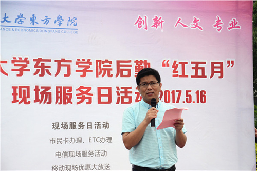 启动仪式上,公共事务部部长余健介绍了此次“红五月”系列活动的情况。有“自觉行动真情服务,师生互动拉近你我,源于平凡榜样激励”等三大主题,共11项活动。既有全新的主题活动和服务承诺,也有继承发展的品牌性活动,活动内容较为丰富。希望通过活动创造良好的沟通交流平台,拉近后勤与师生的距离。进一步提高学院后勤的服务质量,增强与师生员工的互动,调动广大员工的积极性,为学院转型发展和人才培养工作提供强有力的后勤保障。