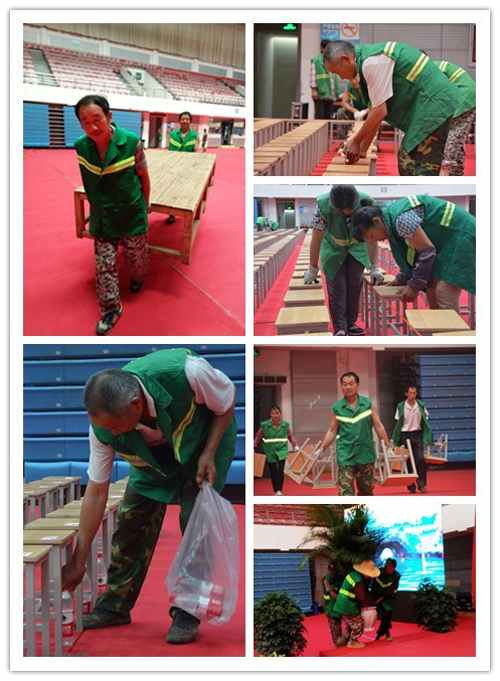 面对如此重大的任务,绿保人早筹划、严执行、重落实。20日早上6点半,绿保中心全体工作人员已经就位,清理体育设备、摆放主席台架、铺地毯、运凳子、摆凳子、摆放矿泉水、布置主席台……,各项工作一环紧扣一环。经过14个小时的辛勤劳动,15块总重近5000斤的地毯,22个主席台位,近200盆鲜花,2350个凳子,4620瓶矿泉水,全部整齐有序的布置到位。体育馆由羽毛球场地华丽蜕变为毕业典礼礼堂。