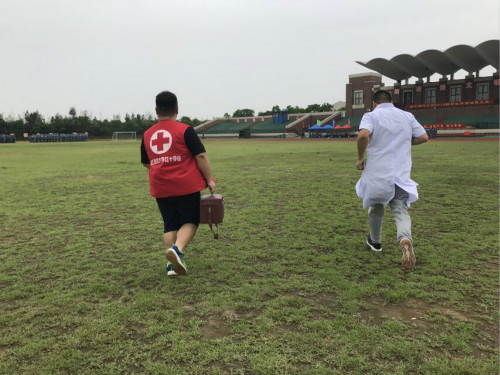 校医院在军训场地设立了3个医疗点,每天安排2位医护人员,35度的高温下,他们在医疗点与军训方阵中穿梭。有中暑的学生倒下了,他们冲上去救助,顾不上擦一下头上的汗;有晕倒的同学磕破了膝盖,他们冲上去处理,顾不上多喝一口水……有这群可爱可敬的“白大褂”的守护,学生们军训更加安心了。除了提供现场医疗救助以外,校医院医护人员也会在每天训练前后观察参训学生的健康状况,确保学生健康参训,平安结训。每天,他们都是第一个来到军训场地的人,也是最后一个离开场地的身影。此外,校红十字会志愿者也积极加入到医疗队的服务中来,每天2-3名志愿者轮流值班。截止到7月5日为止,校医院医护人员累计值班人数14人次,服务42小时,处理伤员243人次。