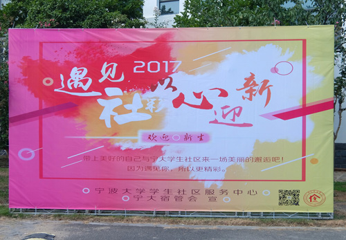家具改造、工程施工后的工作量是巨大的。学生社区服务中心所有员工在开学前加班加点做好检修、保洁等各项工作,为的就是让新生能住的开心、家长看了安心。迎新当天,学生社区内挂着宣传海报或喷绘,营造了浓厚的迎新氛围;宿管大妈大伯真诚的第一个微笑、细致的各项温馨提示;维修工高效率的紧急抢修;宿管会学生贴心的志愿服务,实用的一卡通卡套,都是学生社区送给新生的第一份礼物。