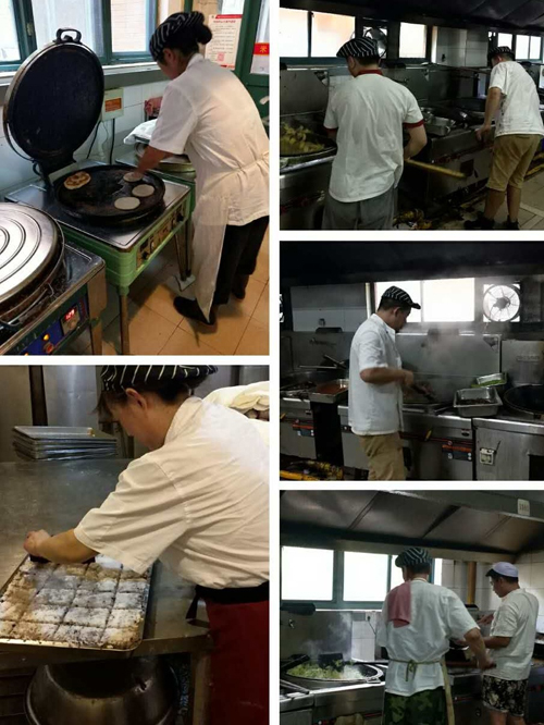 暑假期间,虽然就餐人数相对减少,但值班食堂仍紧绷食品安全弦,确保食品安全和饭菜质量。各类炒菜、面食、风味小吃、粥类等,应有尽有,减供应总量,不减品种数量。炎炎夏日,进食堂的后厨就像进桑拿房,厨师们在近50℃炉温的大锅灶旁,挥汗烹制各种菜肴,工作一天下来,工作服干了又湿、湿了又干,趁着空闲的时间,他们反倒宁愿去门外的太阳底下透透气。