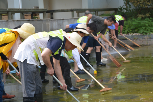 8月24日下午,在一场阵雨还没有下完,全体党员和中心年轻骨干就投入到劳动中,趁着“好天气”,抢时抢工,将人文楼南侧两个景观水池清洗一新。天气闷热,大家汗如雨下却不言辛苦。