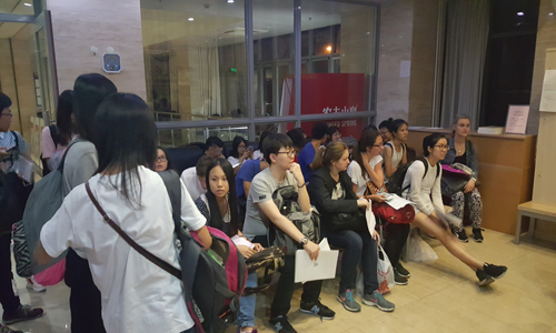 ▲为夜间航班到京的国际小学期境外学生办理入住手续