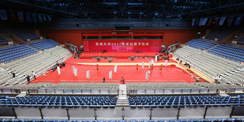 夏影蝉鸣,凤凰花开,6月28日,独墅湖体育中心内人声鼎沸,气氛热烈。苏州大学2017年学位授予仪式在这里成功举行,包括5020名本科生、3293名硕士生和345名博士生以及各主礼教授在内的8000多人参加了此次学位授予仪式。仪式现场的布置整齐划一,场面井然有序。