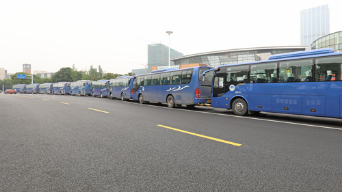 数十辆大巴车整齐地停靠在体育中心路边