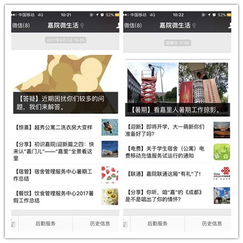 “嘉院微生活”微信平台及时推送新生解惑、新生须知、床上用品订购与空调房申请等后勤服务信息。综合办公室设计制作了后勤服务集团迎新服务指南,提前将指南折页册分发到三个迎新点和各个学院,方便新生在报到时领取。服务指南高度浓缩、以一问一答的形式解答校园生活疑问,帮助新生迅速适应新的学习生活环境。