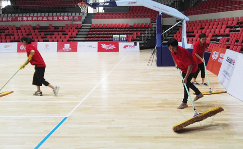 周亦卿综合体育馆能够容纳4千多名观众,学校师生观赛热情较高,尤其是最后一天的决赛,几乎场场爆满。由于赛程时间较短,赛事安排较紧密,一上午或一个晚上都安排上了3场比赛,往往上午比赛结束都12点半多了,物业服务团队的队员们坚守着自己的岗位直至比赛结束、人员赛场,匆匆去解决完午饭,又投入到场地保洁、规整工作中。天公不作美,连天阴雨,保洁员要及时清理地面的水迹,不停地来回作业;保安人员更是冒雨引导、规整球馆周边的自行车、电瓶车,协助体育学院及保卫处做好参赛球队及观众引导工作等,更是增加了工作难度。晚上比赛结束一般都十点多了,保洁员要及时地清理球场内的饮料空瓶等各类垃圾,确保第二天一早的比赛能够正常进行。保安人员巡查大楼各个角落,确保安全无误后,才关门落锁。等他们完成工作回家已经是晚上十一点多了。