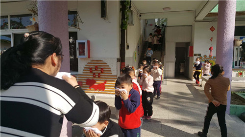 上午九时许,孩子们正在专心地上课,忽然听到紧急的警报声,各班教师迅速按紧急预案的疏散线路带领幼儿拿起湿毛巾,捂住口鼻,猫着身子,分两道楼梯迅速且有序下楼。孩子们很快集中到操场安全地带,教师迅速地清点人数,并向总指挥报告。整个疏散活动只用了1分多钟。本次演习特邀了江北区文苑派出所黄警官来园消防安全培训,他用通俗易懂、生动形象的语言,向小朋友们详细讲解了预防火灾发生注意事项,在发生火灾后如何进行自救、如何逃走、如何拨打119电话报警等知识。最后,保安师傅们为现场师生们演示灭火器的使用。