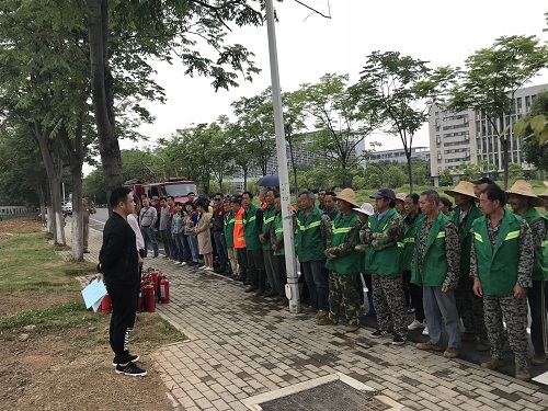 培训现场,尽管细雨霏霏,但管理人员和一线员工的热情不减,列队整齐,翘首以待培训的开始。校保卫处陈老师详细地向到场人员讲授了灭火器的适用场合、灭火原理、运用技巧和注意事项等,即“拔、握、压、喷”,同时灭火人员需站在火势的上风口,确保自身安全。在保卫处工作人员的配合和指导下,到场人员依次进行灭火实操。整个演练安排有序、组织得力、效果显著。