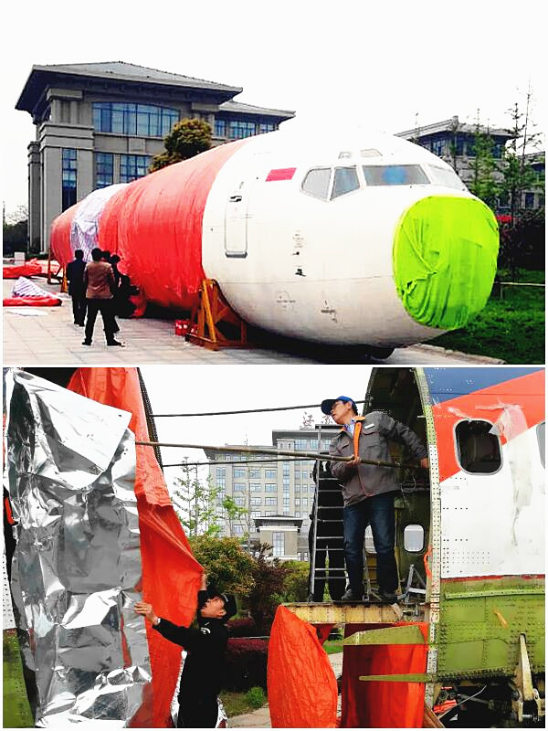 为顺利迎机,早在寒假期间,项目部就在学院后勤处领导带领下着手前期工作。经过近两个月的翘首期盼,4月14日早,飞机各分割部分依次抵达。校园内沸腾了!春雨阻挡不了大家一睹为快的心情,师生们纷纷拍照留念,并通过网络向家人、朋友分享自豪与喜悦。晚6时许,围观的师生渐渐散去,为使飞机免受日晒雨淋和空气侵蚀,公司工程人员开始对飞机外包装重新处理,同时在飞机安放区域拉起警戒隔离带,做好安保工作,并设置显著标识,向全校师生通告飞机安装接合期间的行走路线,确保施工现场安全。