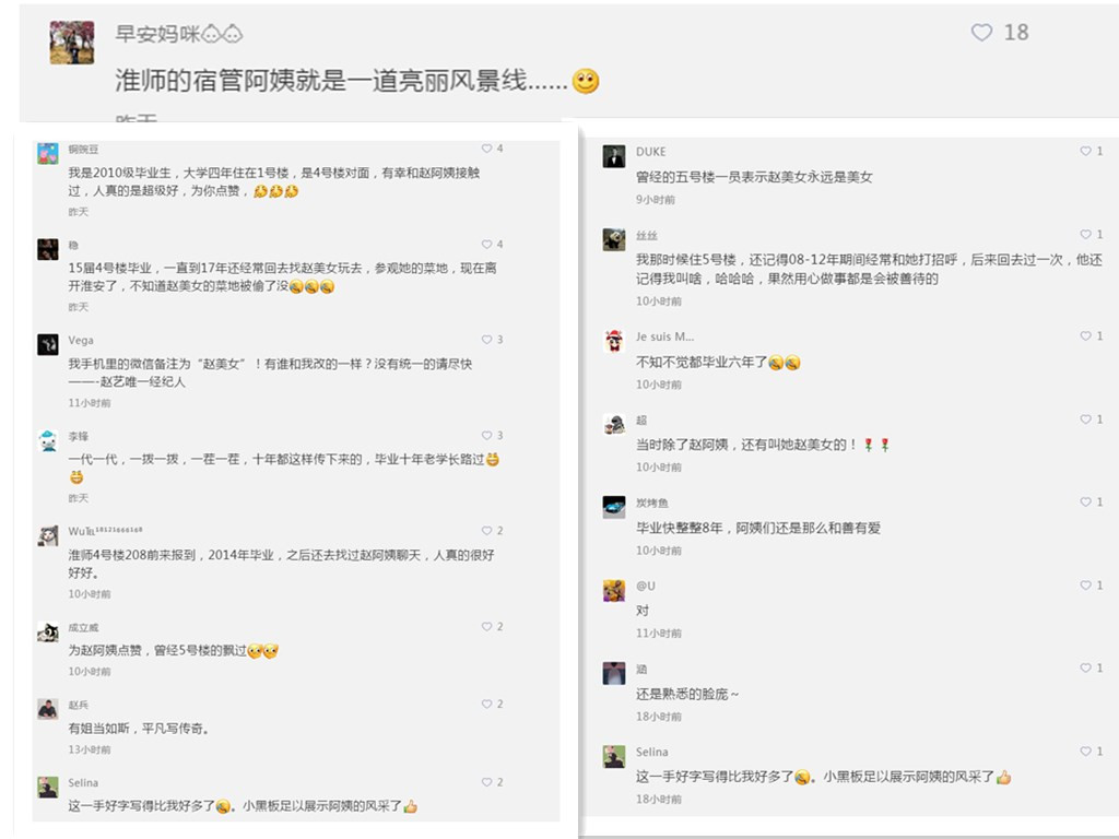 这位“字很漂亮、段子更牛“”、深受学生喜爱、被亲切地称为“赵美女”的赵阿姨,是淮阴师范学院男生宿舍楼一位普通的宿管员——赵艺。她将小黑板上的通知和提醒等写成段子、画成漫画,吸引学生们注意的同时又带给他们温暖和欢乐。