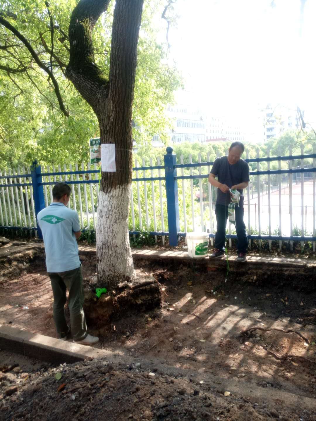 经过一番实地调查后,物业服务部得知导致樟树生长异常的原因是树木立地环境较差,树穴面积狭小,根系生长空间十分有限,因此无法吸收足够的水分养分供给植物生长。探明原因后,物业服务部对症下药,立即施行了治疗措施。