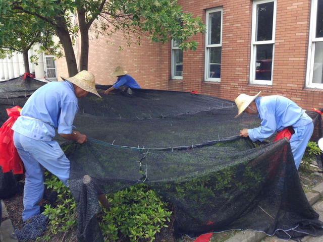 为了在酷暑期间保证草木的正常生长,绿化工们充分利用早晚两个时段对树木进行浇水降温,增加整个绿地小环境的湿度,使土壤持水量相对长久;对于喜阴以及部分新种苗木采用遮阳网遮阳措施,营造植物适生环境并减少水分蒸发量,提高苗木成活率,确保绿化植物顺利度夏。同时,针对台风、暴雨天气,绿化部员工加强巡逻,提前做好树木支撑工作。台风暴雨过后,及时进行树木回种、固定。绿化员工们抗旱防台保绿护绿,用汗水浇灌着绿荫,为创建美丽校园默默奉献。
