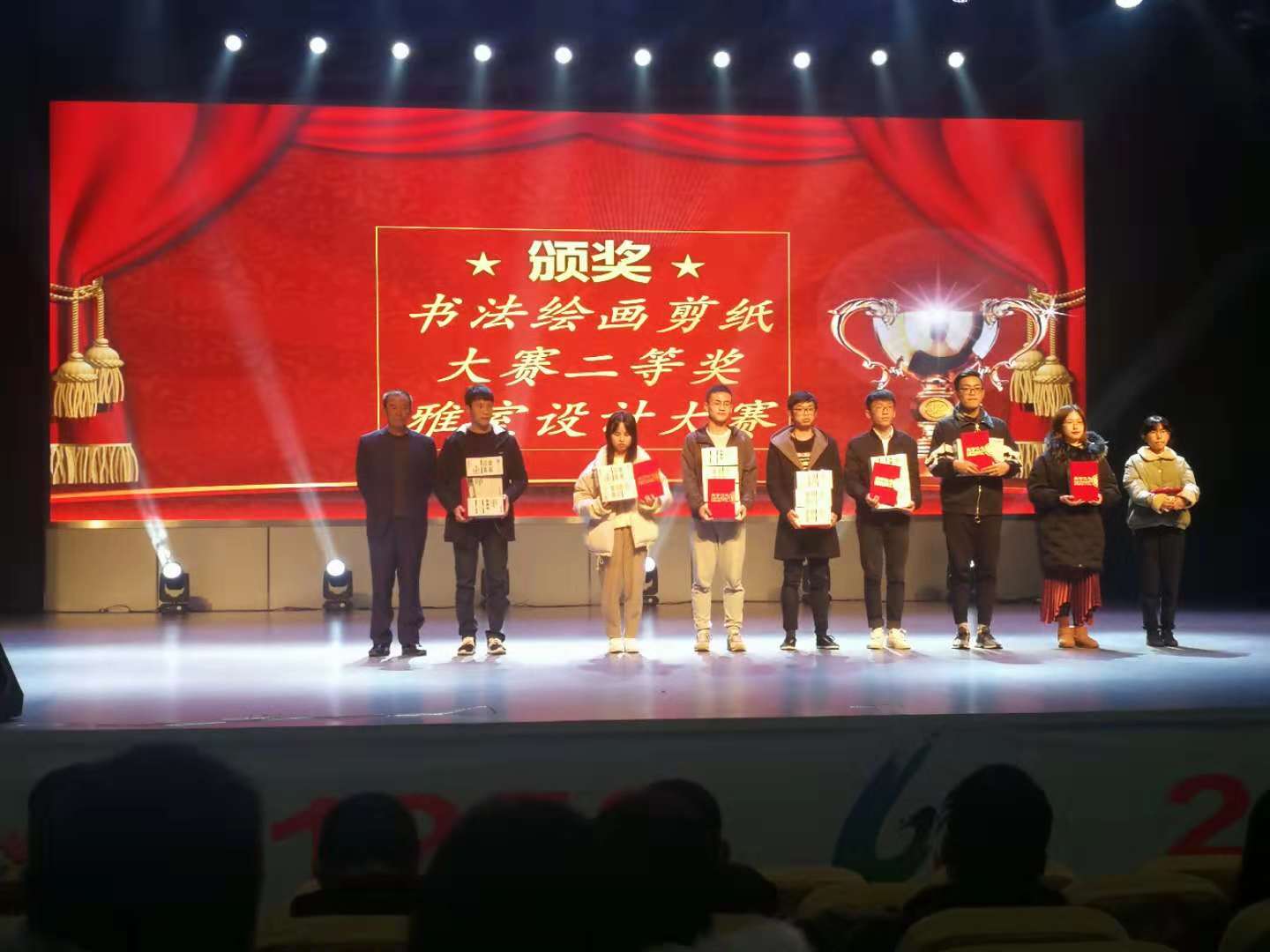 晚会在《babe》精彩的舞蹈中拉开了序幕,晚会现场的气氛瞬间被点燃,基建与后勤管理处副处长陆松波为文化节闭幕式致辞。本场晚会节目内容丰富,形式多样,融歌曲、舞蹈、器乐等多种表演形式于一体。四名古筝演奏者带来了《核爆霍元甲》引爆全场;《2018,你们走了》诗朗诵生动地表达了现代大学生对2018年杰出人士的缅怀之心与敬仰之情;越剧《心连心》,曲调优美,舞姿温柔缠绵,唱腔婉约轻灵,更是让在场的师生赞不绝口。晚会还穿插了颁奖环节,为此次公寓文化节书法剪纸绘画大赛、雅室设计大赛、趣味运动会中评选出的获奖者颁发奖品和荣誉证书。晚会中阵阵掌声和欢呼声此起彼伏,台上台下成了一片激情洋溢的海洋。