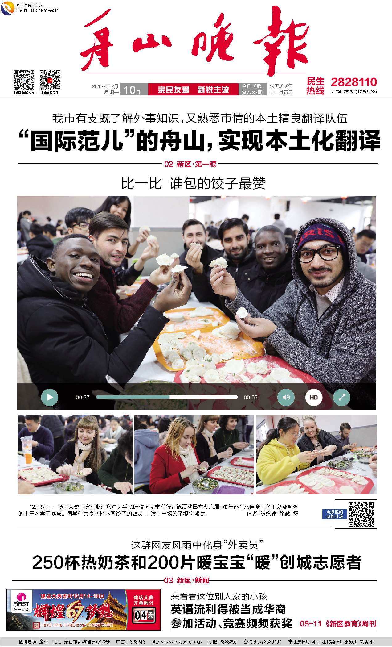 12月8日、9日,由基建与后勤管理处饮食服务中心和膳食管理员会联合举办以“包暖暖温情 饺天下朋友”为主题的基建与后勤管理处第六届优质服务月之千人饺子宴活动分别在新城食堂一楼和定海第一食堂举办,来自全国各地和大洋彼岸的共千余名师生欢聚一堂,一起包饺子,体验中国饮食文化。