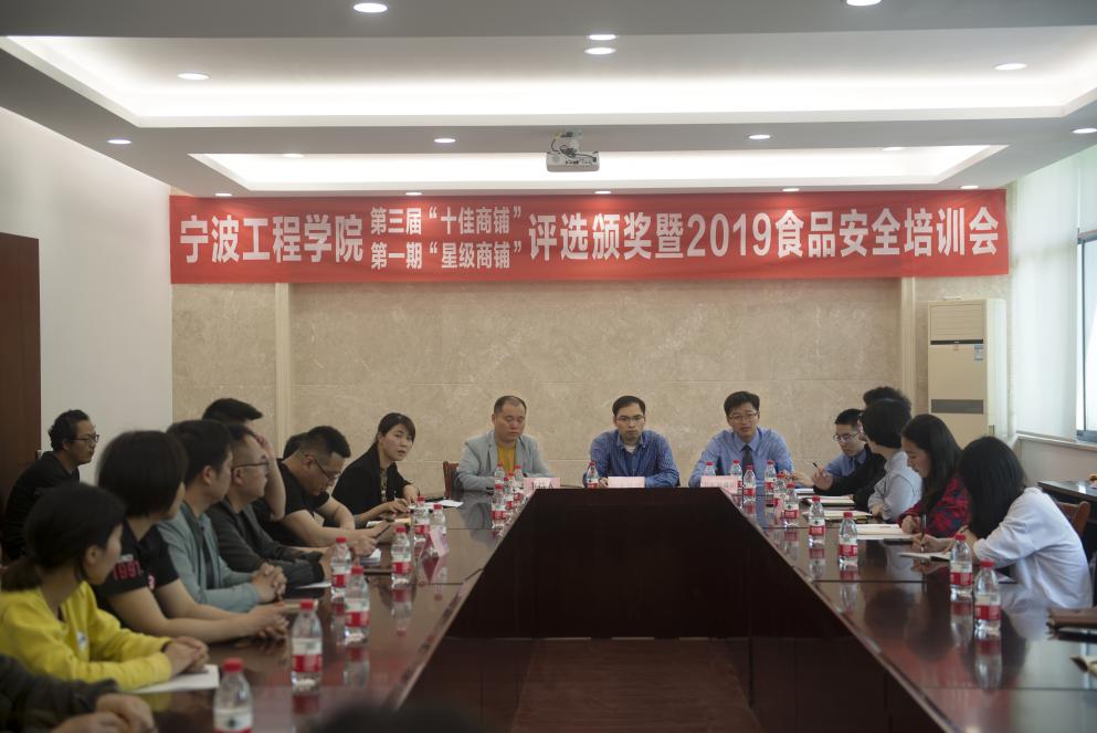 4月18日下午,宁工第三届“十佳商铺”、第一期“星级商铺”评选颁奖暨2019食品安全培训会在医务室三楼会议室召开。后管中心副主任陈彪、江北区甬江市场监督所领导、校团委、学生会代表、商贸中心工作人员和各商户代表共60人参加会议,会议由商贸中心主任徐小兵主持。