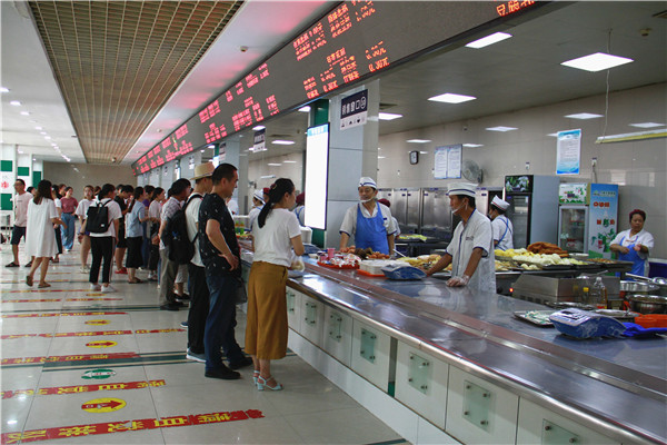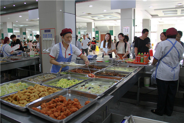 食全食美,带您品尝嘉里味道。迎新期间,为方便新生及家长就餐,饮食管理服务中心联合计划财务部制作了校内各自营食堂通用的1元、2元、5元等不同面值的餐券,全天在各食堂驻点销售,为新生及家长顺利就餐提供帮助。开餐期间,饮食管理服务中心安排服务人员为新生及家长答疑解惑并提供必要的帮助;同时延长早、中、晚餐的供餐时间,满足新生及家长就餐需求。在菜肴品种上,食堂在注重营养搭配的基础上,多做出品较快的菜品,提高出菜速度,减少学生和家长的等待时间。各食堂还提供免费汤饮,供新生及家长消暑解渴。